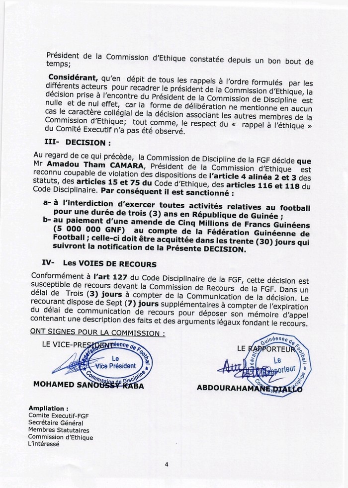 Par conséquent, la commission de discipline interdit à Tham Camara d’exercer “toutes activités liées au football pour les 3 prochaines années. Il devra aussi s’acquitter d’une amende qui s’élève à 5 millions de francs guinéens”.