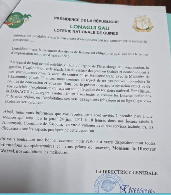 Le pouvoir va-t-il fermer la puissante société Guinée Games ? Dans une correspondance -qui agite la toile- adressée au directeur général de Guinée Games, Aminata Sylla, directrice générale de la Lonagui SAU a annoncé la cessation du contrat de concession signé en juillet 2001 avec la société des jeux de hasard. Les raisons ? Elle motive sa décision par entre autres le “non-respect des clauses essentielles du contrat initial et de ses avenants…”