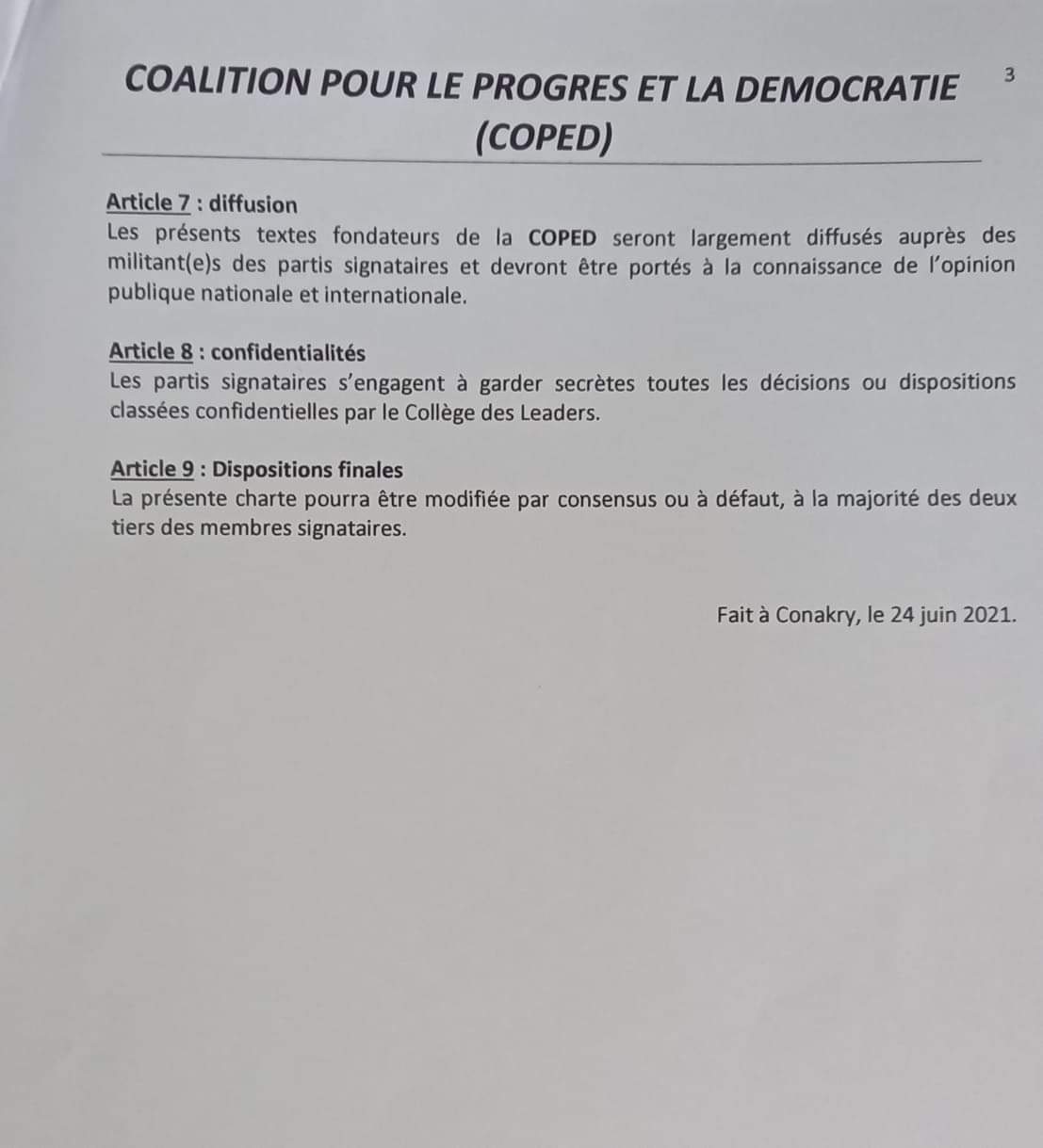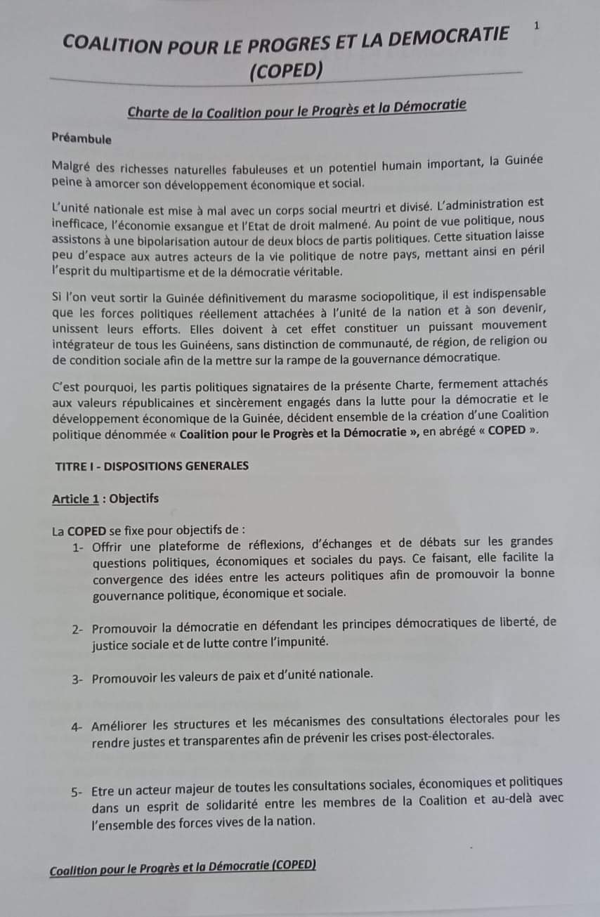 Des partis politiques composés du PADES du Dr Ousmane Kaba, du RRD de Abdoulaye Kourouma, du PDG-RDA de Oyé Béavogui, du MND du Dr Ousmane Doré, du PGSD de Élie Kamano, du PPD de Boubacar Diallo, de la NGR de Ibrahima Abé Sylla ont créé une nouvelle coalition politique dénommée “Coalition pour le Progrès et la Démocratie (COPED). L’annonce a été faite ce Jeudi 24 juin, à la maison de la presse. Ci dessous, la charte de la coalition….
