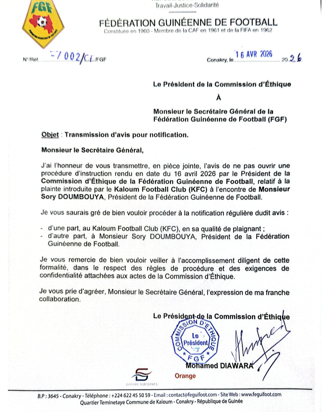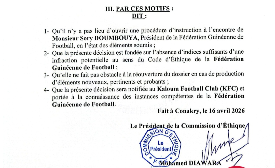CONAKRY- Alors que sa décision était vivement attendue dans l’affaire de l’audio incriminant Sory Doumbouya, la commission d’éthique de la fédération Guinéenne de Football décide de ne pas sanctionner le président.