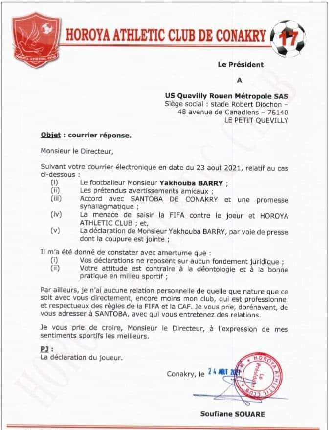 “Vous avez signé avec QRM et Santoba un contrat de transfert de joueur professionnel le 1er juillet 2021. Malheureusement, en violation de ces engagements contractuels, il semblerait que vous (Gnagna), ayez décidé de prolonger votre relation contractuelle avec le Horoya. A défaut de réponse satisfaisante sous 48h, le QRM n’aura malheureusement pas dautre choix que de saisir la FIFA contre vous et le Horoya, pour rupture sans juste cause de votre contrat” menace le club français.