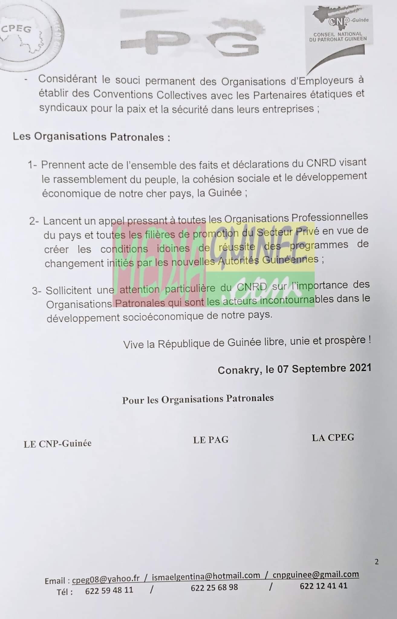 2- Lancent un appel pressant à toutes les Organisations Professionnelles du pays et toutes les filières de promotion du Secteur Privé en vue de créer les conditions idoines de réussite des programmes de changement initiés par les nouvelles Autorités Guinéennes;