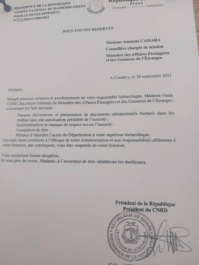 Des cadres du ministère des Affaires étrangères et des Guinéens de l’étranger ont été suspendus par le président du CNRD, le colonel Mamadi Doumbouya, le 23 septembre. Il s’agit de mesdames Mama Aissata Bangoura, directrice générale des Affaires juridiques et consulaires; Aminata Camara, conseillère chargée de mission; de messieurs Framoï Mara, directeur général du protocole et Gaoussou Soumah, chef d’études (inspection générale).