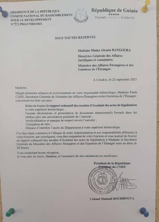 Par ailleurs, il a été demandé à Framoï Mara, concerné par le « refus de fournir le rapport exhaustif des recettes découlant des actes de traduction a votre supérieur hiérarchique » et à Mama Aïssata Bangoura, concernée par le « refus de fournir le rapport exhaustif des recettes découlant des actes de législation à votre supérieur hiérarchique », de fournir lesdits documents à la secrétaire générale dudit ministère. Ci-dessous, les actes.