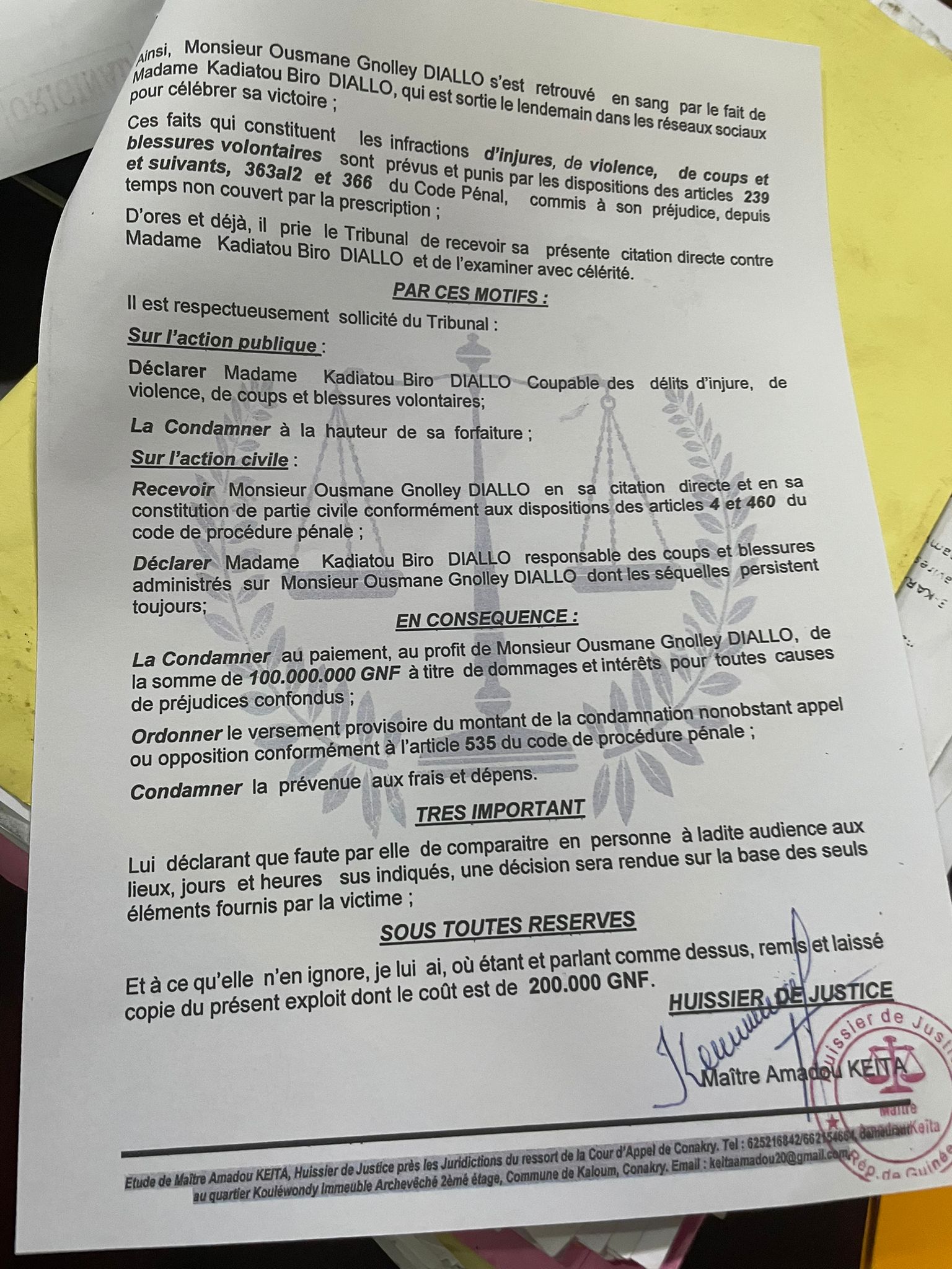 Selon la citation délivrée à cet effet, l’audience est prévue le 30 décembre prochain au tribunal de première instance de Dixinn.