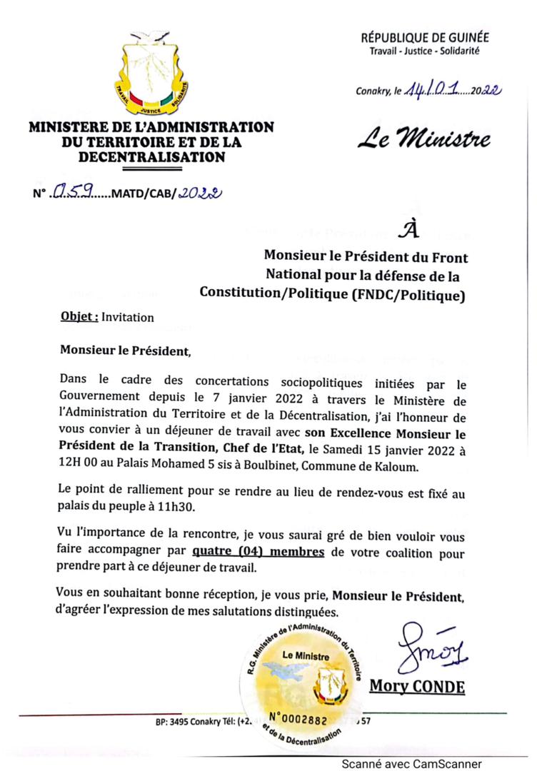 Les nombreuses coalitions politiques dont la CORED, l’ANAD et le FNDC politique ont toutes reçu leurs invitations signées du ministre de l’Administration du territoire et de la décentralisation Mory Condé.
