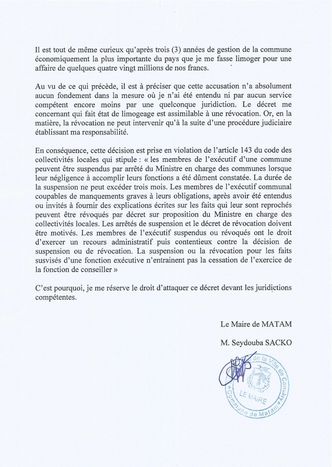 Limogé hier, par le colonel Mamadi Doumbouya, chef de la transition, pour des faits notamment de détournement de derniers publics, Seydouba Sacko, rétorque à travers une lettre que voici.