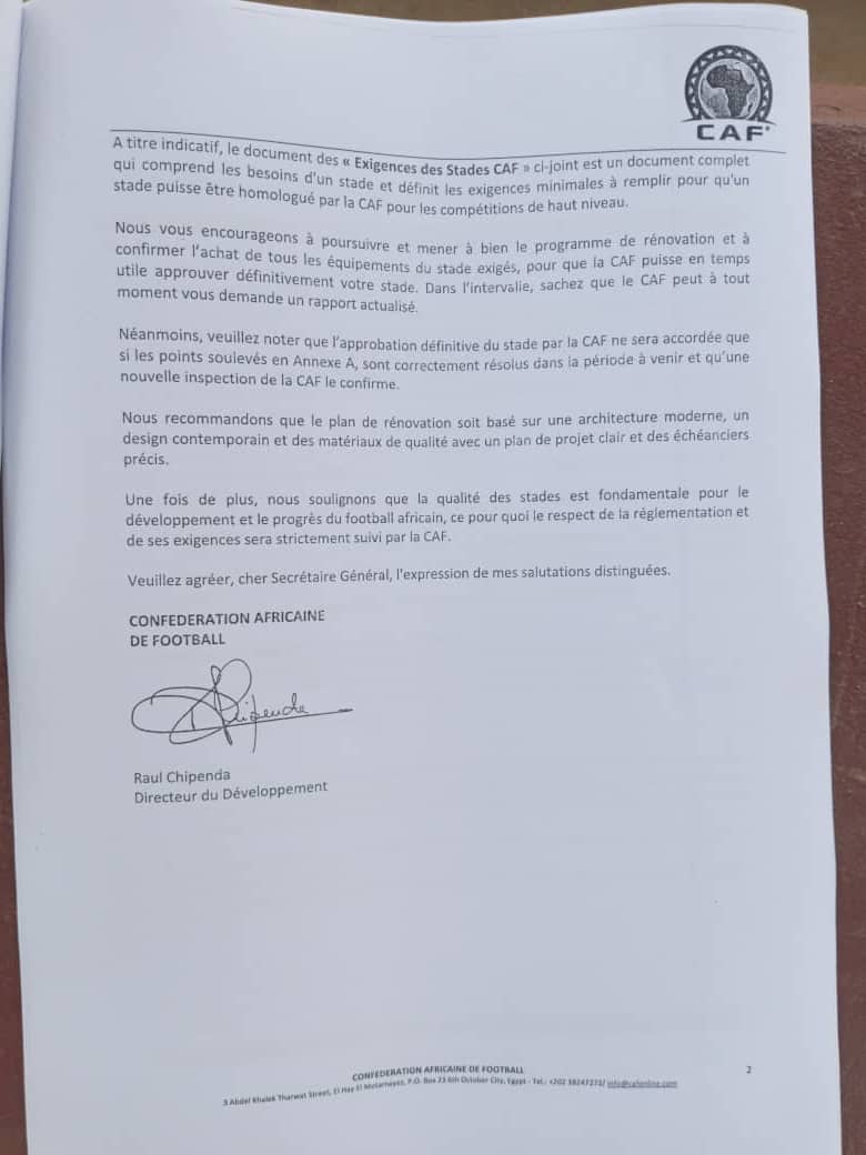 Ci-dessous, le courrier autorisant la réception des matchs des journées 1-2 des éliminatoires de la CAN 2023.