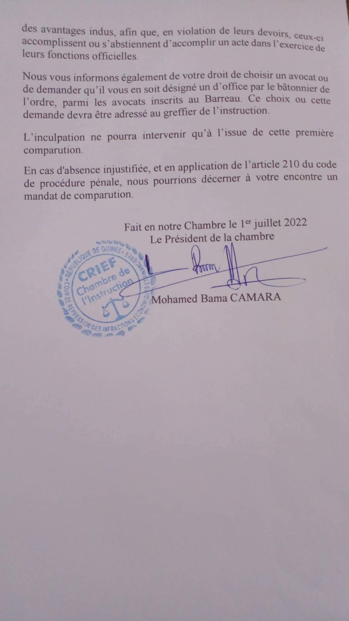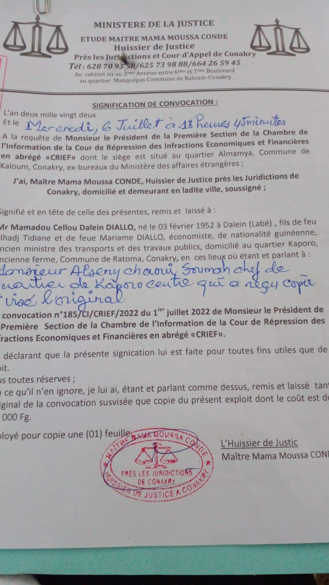 Finalement l’on sait ce que la Crief [Cour de répression des infractions economiques et financières] reproche à Cellou Dalein Diallo, convoqué le 15 juillet prochain. Dans la 2è convocation adressée au leader de l’UFDG, la Chambre de l’instruction de la CRIEF l’accuse de « détournement ou soustraction au préjudice de l’Etat guinéen, la somme de 5 millions (5 000 000] de dollars US issue de la cesson des avions 737-200 et Dash 7, leurs pièces de rechange ainsi que les revenus issus de la location des installations de l’ancienne compagnie nationale Air Guinée ».