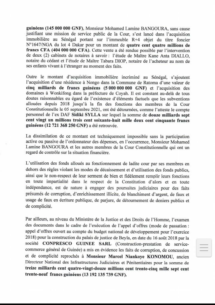 Mohamed Lamine Bangoura, ancien président de la Cour constitutionnelle et d’autres cadres de ladite institution, sont visés par une injonction de poursuite judiciaire.
