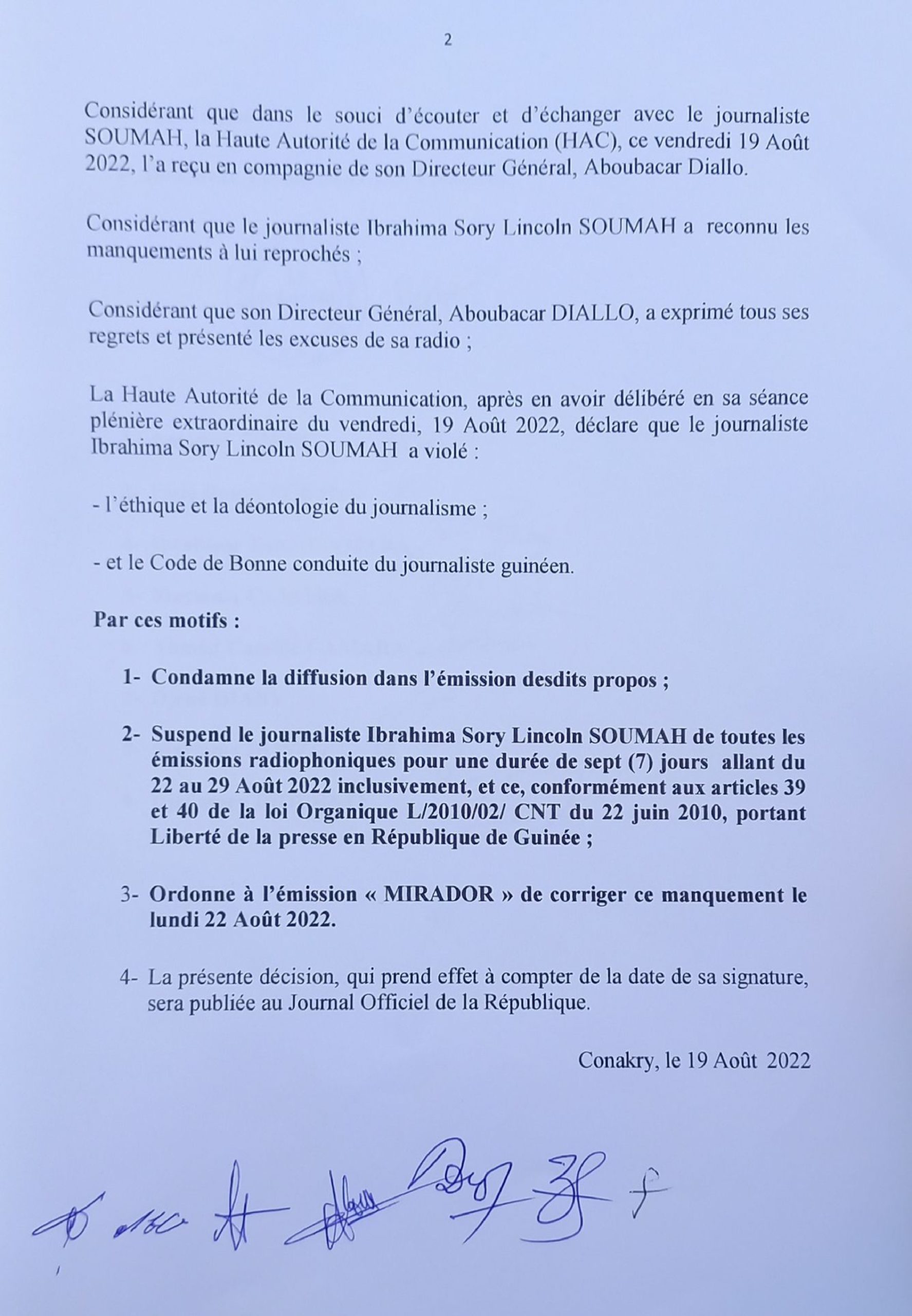 La Haute Autorité de la Communication (HAC) a suspendu vendredi le journaliste Ibrahima Lincoln Soumah [de Fim fm] de toutes émissions radiophoniques pour une durée de sept jours allant du 22 au 29 août 2022 inclusivement. Ordonnant à l’émission « Mirador » de corriger ce manquement le lundi 22 août 2022.