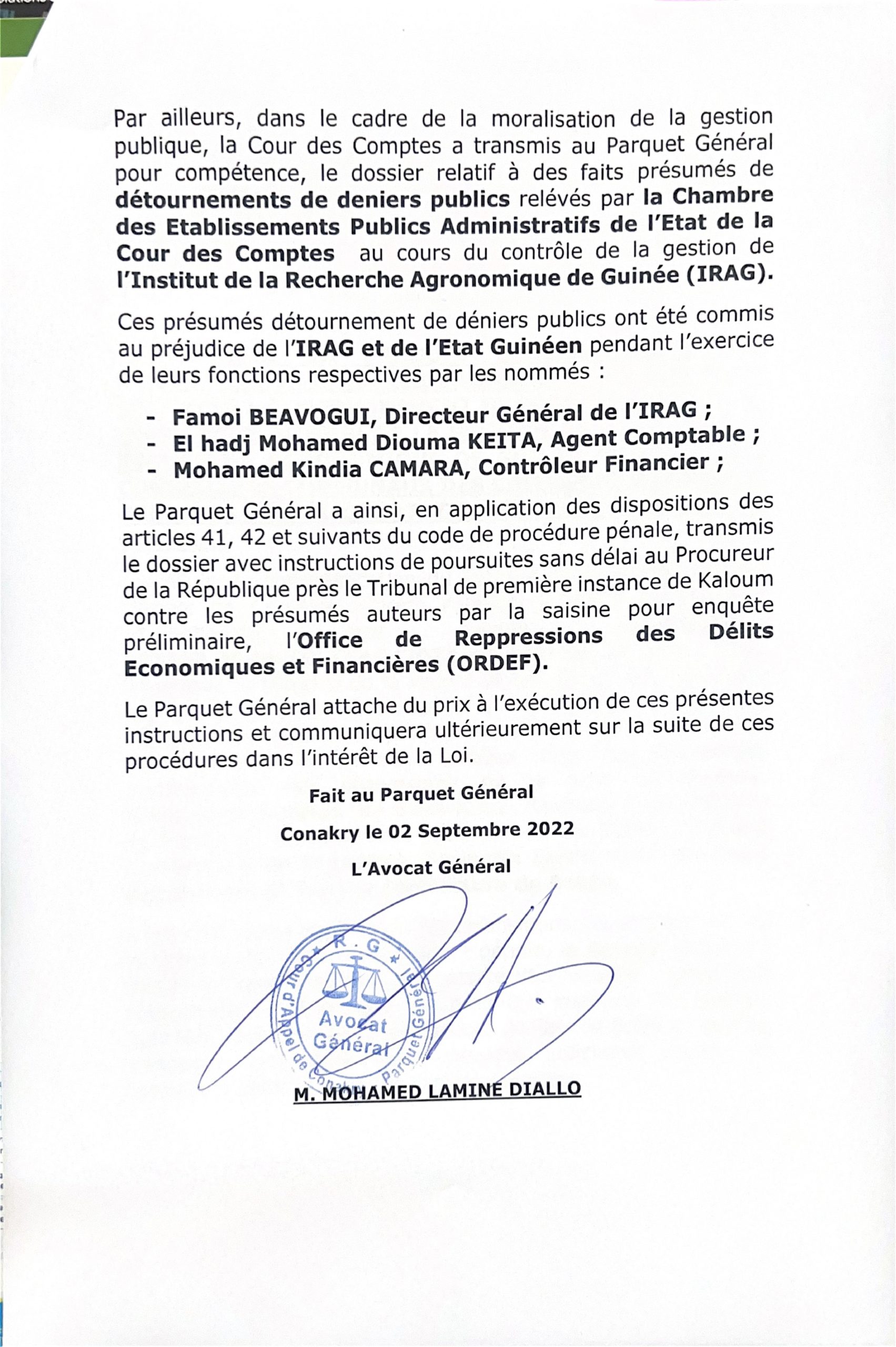 Par ailleurs, le parquet annonce aussi des poursuites judiciaires contre trois fonctionnaires de l’IRAG pour présumés détournement de deniers publics.