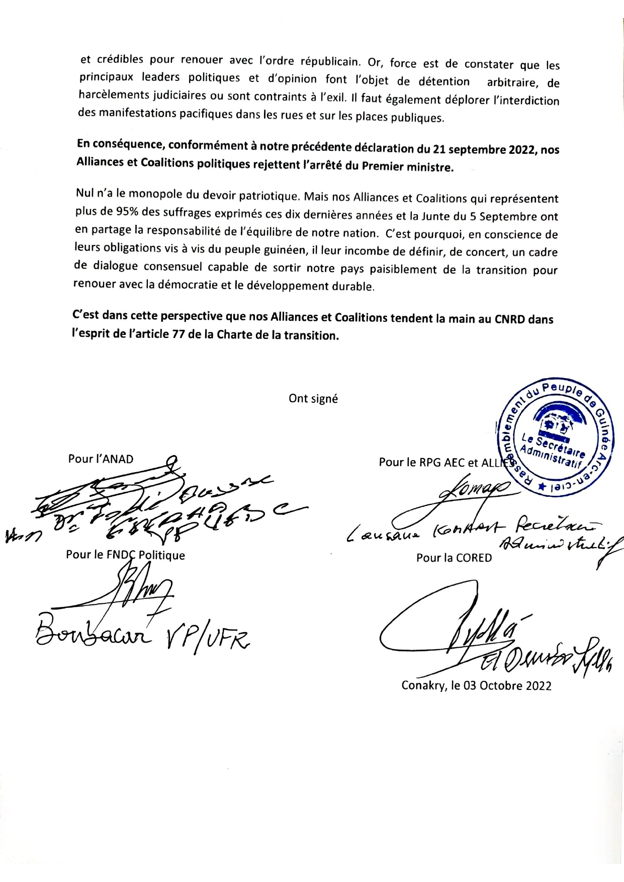 L’arrêté du Premier ministre Dr Bernard Goumou portant mise en place des facilitateurs nationaux du cadre de dialogue inclusif ne passe pas. Les Allainces et coalitions de l’ANAD, du FNDC Politique, de la CORED et du RPG AEC et Alliés ont rejeté lundi, 3 octobre ledit arrêté et rappelé que leurs propositions antérieures n’ont pas été prises en compte. Déclaration