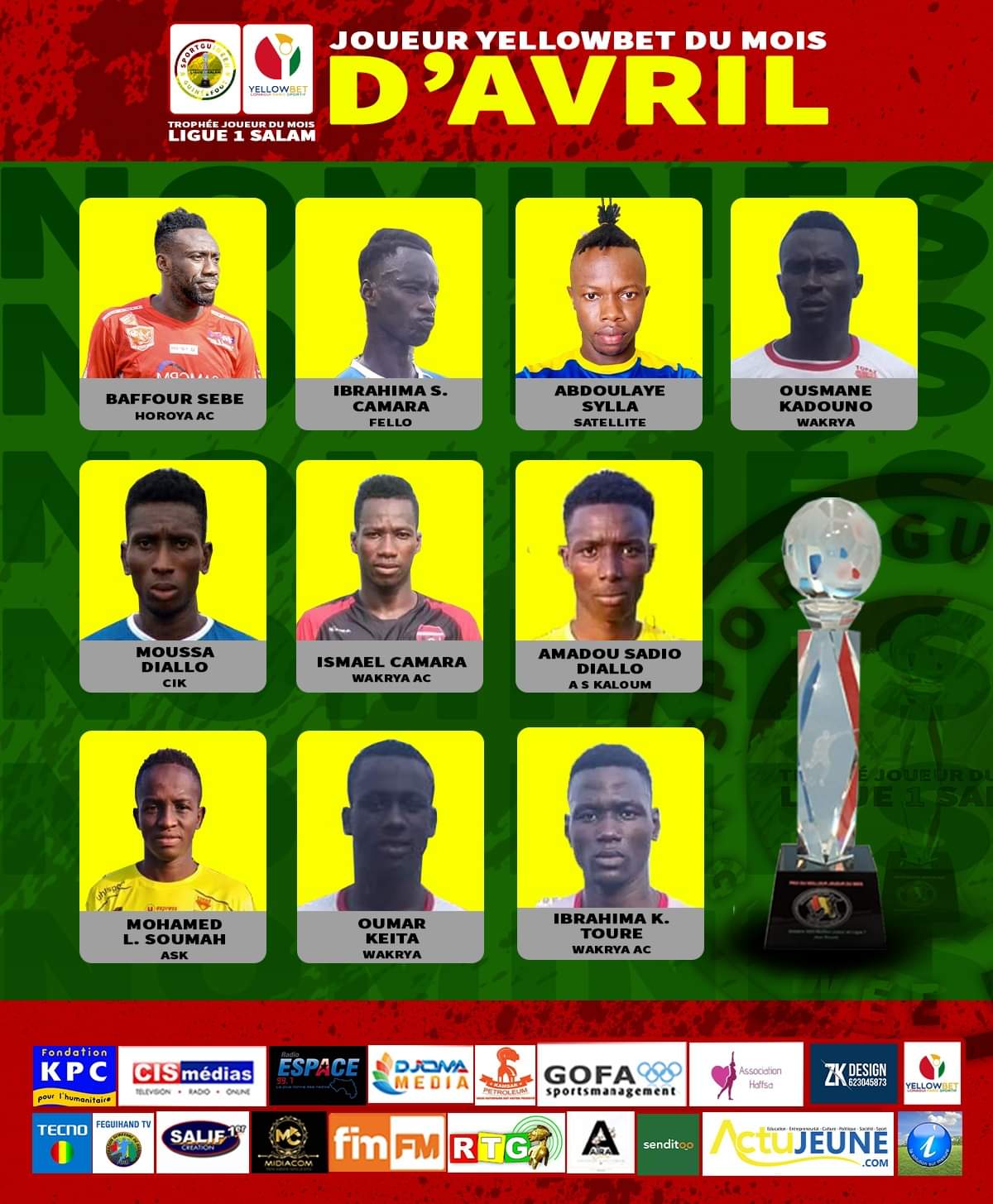 CONAKRY– La commission d’organisation du Trophée Yellowbet Joueur du mois, organisé par Guineefoot.info et Sportsguineens, a publié ce samedi la liste des joueurs nominés pour le compte du mois d’avril. Au total, ils sont 10 joueurs à se disputer cette récompense durant les 4 dernières semaines en championnat national de ligue 1. Avec 4 joueurs, le Wakriya AC est le club le plus représenté dans cette liste.