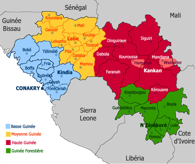 Située en Afrique de l’Ouest, la République de Guinée couvre une superficie de 245 857 km2 avec plus de 300km de littoral Atlantique. La Guinée est composée de quatre régions qui sont : la Basse Guinée ou Guinée Maritime, la Moyenne Guinée, la Haute Guinée et la Guinée Forestière.
